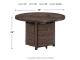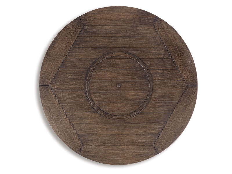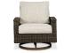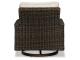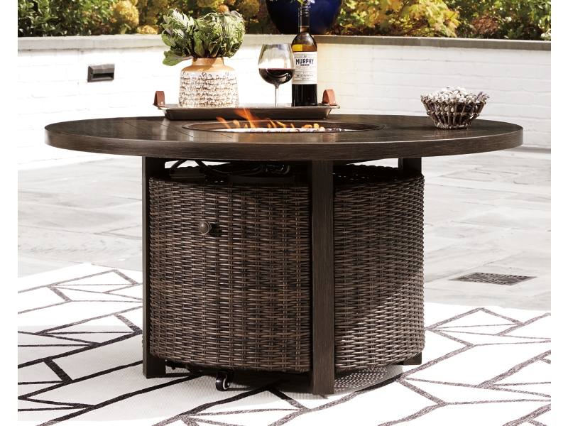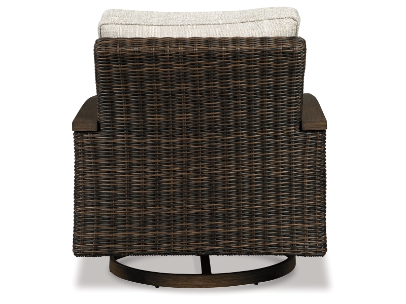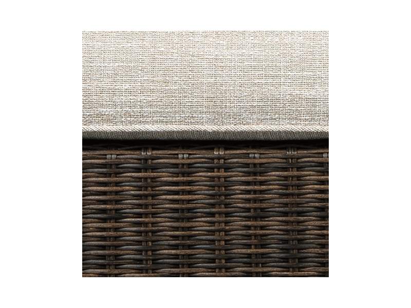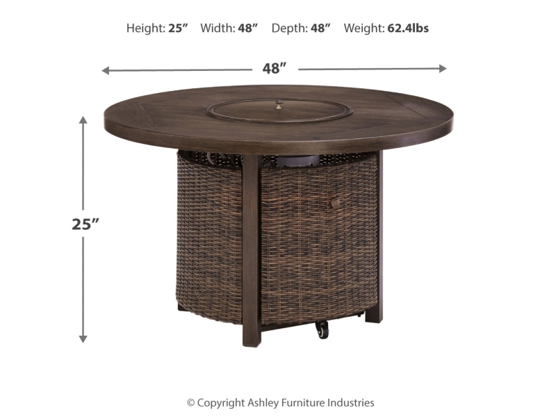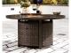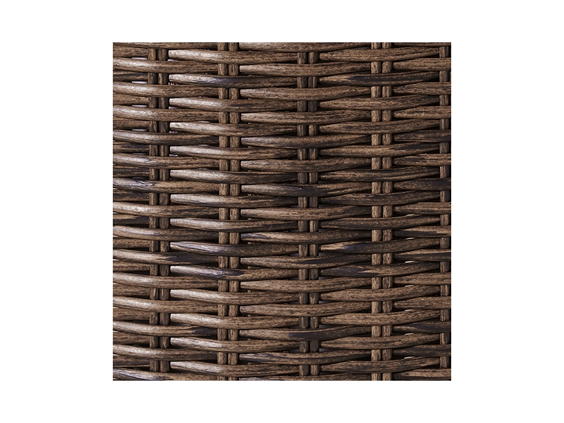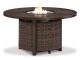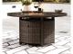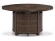 Collection has hand woven resin wicker with rust free aluminum frames with a brown wood-look finish. All cushions and throw pillows are made with Nuvella high performance fabric. Choose from dining, bar table and seating sets. For dining, choose from stationary dining chair or swivel rocker dining chair. 56" square bar table includes 55,000 BTU CSA approved stainless steel burner, enclosed storage area with shelves. Stools have fast dry foam seats below the woven resin wicker to provide comfort. No seat pads needed for barstools. To order a 9-piece bar table set, order P750-130(4) and P750- 665. Assembly required for all skus.
