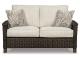 Pretty enough for trendy interiors, yet durable enough to weather the elements, this outdoor package rises to the challenge beautifully. Handwoven resin wicker over rust-proof aluminum merges high style with low maintenance. Rest assured, though the exposed armrests and feet look remarkably like wood, their sturdy aluminum construction is perfectly suited for alfresco living. Plush seat cushions and throw pillows wrapped in high-performing Nuvella® fabric aim to please.