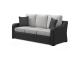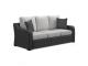 Resin wicker on an aluminum frame. Stainless steel hardware. Porcelain top umbrella table. Umbrella hole. Nuvella high performance fabrics. P792-835 has Nuvella high performance light gray fabric. Includes two throw pillows.