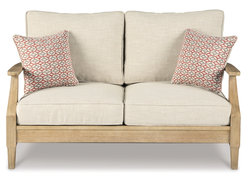 An effortlessly elegant choice in outdoor furniture, this outdoor loveseat marries sturdiness and style in such a delightful way. For that much more weather protection, the loveseat’s eucalyptus wood frame with tapered touches and slat styling is treated to a 5-step finishing process. Sumptuously soft yet remarkably durable, the included cushions and colorful throw pillows are wrapped in a high-performing, low-maintenance Nuvella® fabric you’re sure to love.