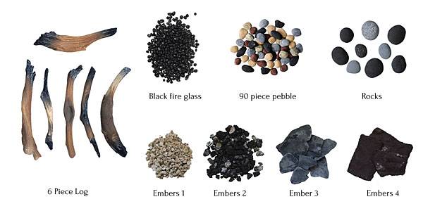 Deluxe 6 piece log set with designer decorative media including black fire glass, 90 piece pebbles, rocks, embers.