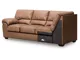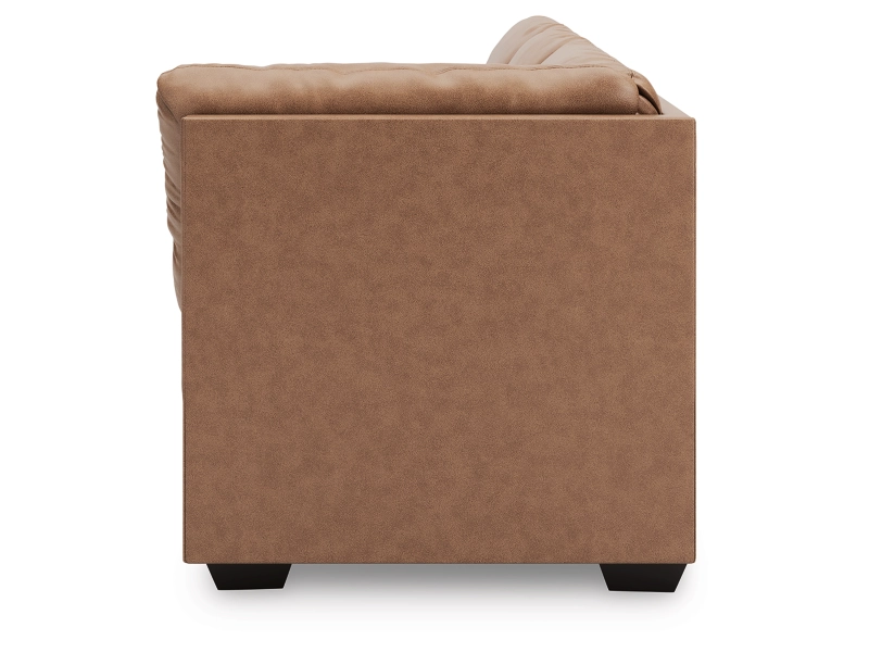 New look to a great looking frame, your choice sofa group or sectional. Offering loose non-reversible seat cushion. Upholstered in a great faux leather and accented with jumbo decorative stitching. Accent Tri-Block Legs.