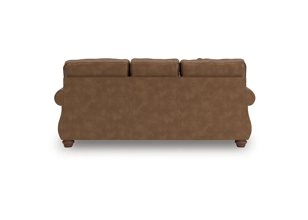 Everyone can have the best seat in the house with this sofa. Its nailhead trim puts the finishing touches on the traditional roll arms you love. Comfy, durable cushions—wrapped in a rustic yet sophisticated faux leather—keep you feeling relaxed. Chenille pillows in a distressed motif pattern add another layer of comfort. And the sofa's turned legs show that style and quality flow from top to bottom.