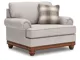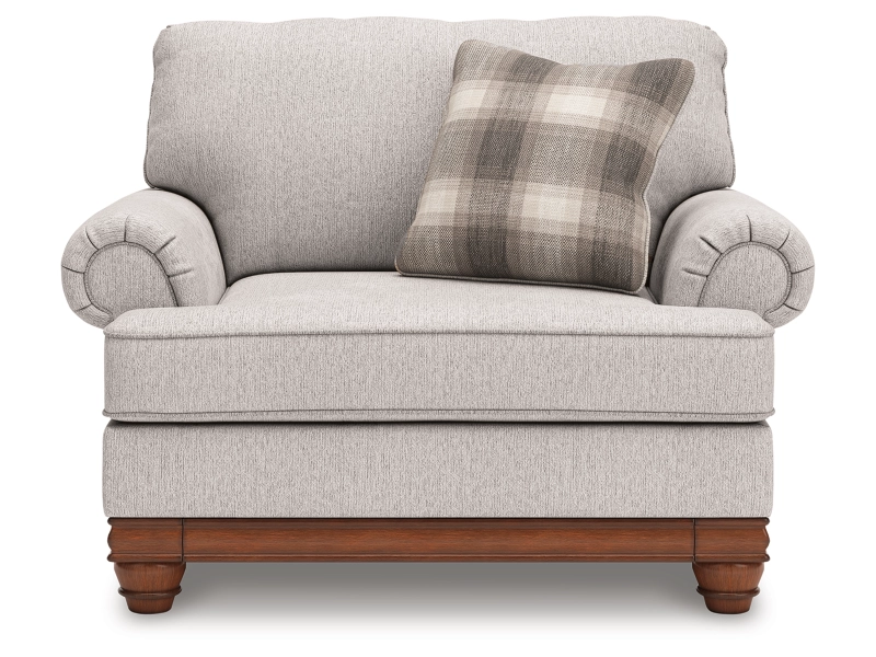 Fresh yet classic. That’s the beauty of this oversized chair. Dressy and also soft to the touch, its organic neutral-toned upholstery is sure to bring a transitional farmhouse aesthetic to your living space. An accent pillow in windowpane plaid infuses a cozy and inviting farmhouse sensibility, while a full wraparound base and decorative turned legs complete the chair's timeless look. It's the perfect place to curl up after a long day.