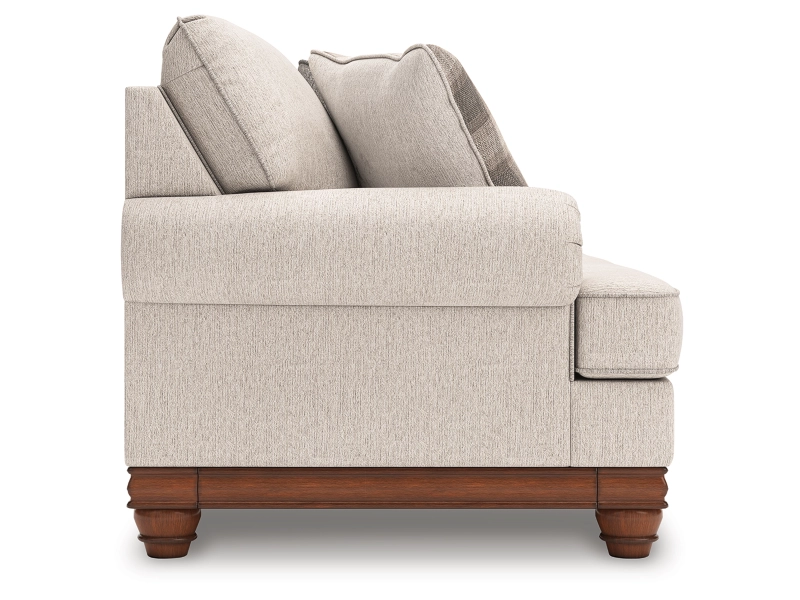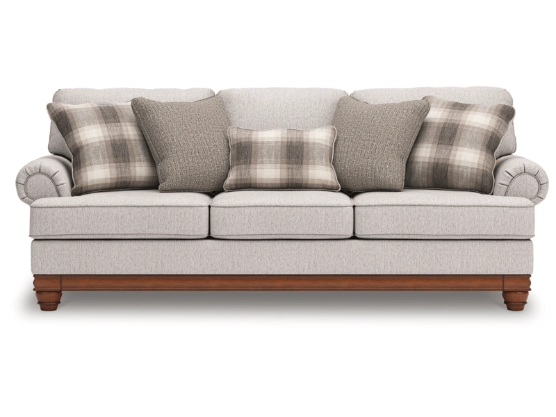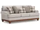 Fresh yet classic. That’s the beauty of this sofa. Dressy and also soft to the touch, its organic neutral-toned upholstery is sure to bring a transitional farmhouse aesthetic to your living space. Accent pillows in windowpane plaid and textured solid hues infuse a cozy and inviting farmhouse sensibility, while a full wraparound base and decorative turned legs complete the sofa's timeless look. It's the perfect place to unwind with your besties after a long day.