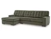 Contemporary Styling sofa chaise sectional upholstered in luxuriously soft velvet in a trend right, rich olive color. Dramatic tufting on backs and seat with flange welt detail. Loose non-reversible cushions, reversible boxed backs and low-profile accent legs.