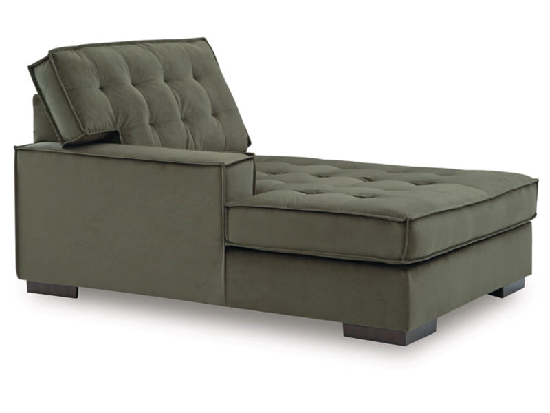 Contemporary Styling sofa chaise sectional upholstered in luxuriously soft velvet in a trend right, rich olive color. Dramatic tufting on backs and seat with flange welt detail. Loose non-reversible cushions, reversible boxed backs and low-profile accent legs.