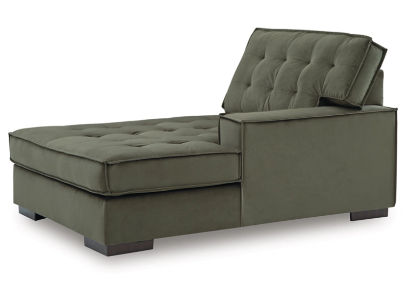 Contemporary Styling sofa chaise sectional upholstered in luxuriously soft velvet in a trend right, rich olive color. Dramatic tufting on backs and seat with flange welt detail. Loose non-reversible cushions, reversible boxed backs and low-profile accent legs.