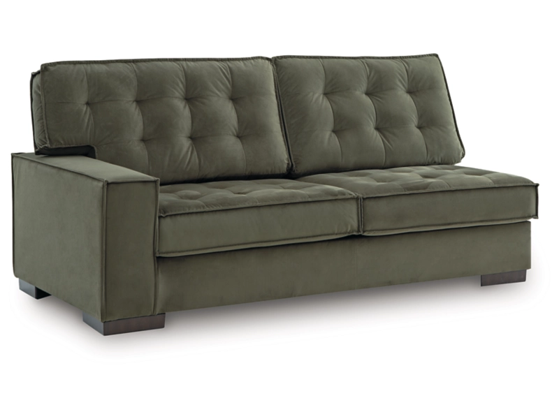 Contemporary Styling sofa chaise sectional upholstered in luxuriously soft velvet in a trend right, rich olive color. Dramatic tufting on backs and seat with flange welt detail. Loose non-reversible cushions, reversible boxed backs and low-profile accent legs.