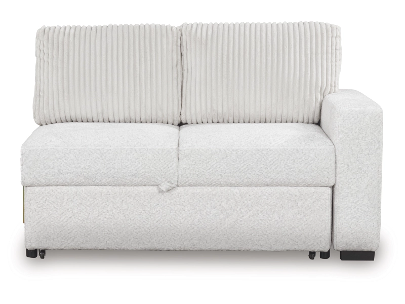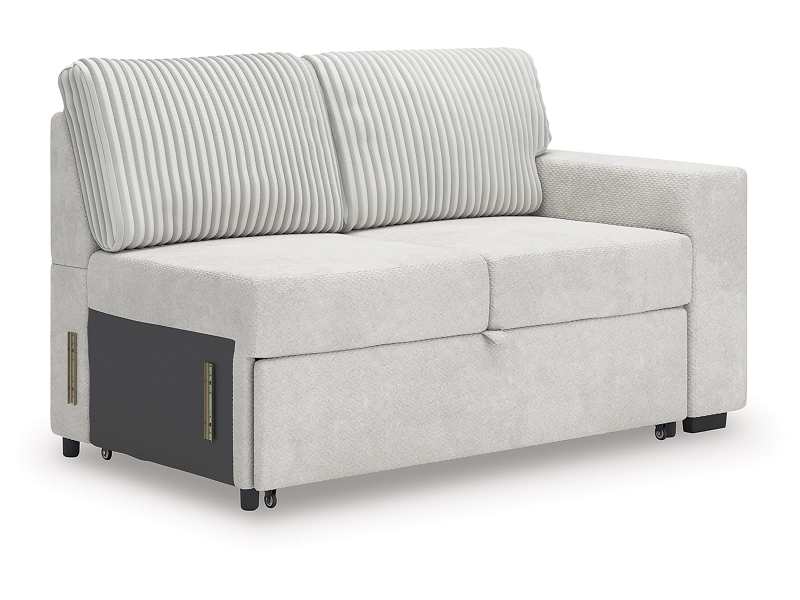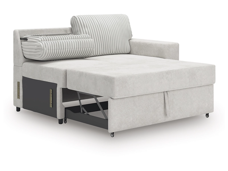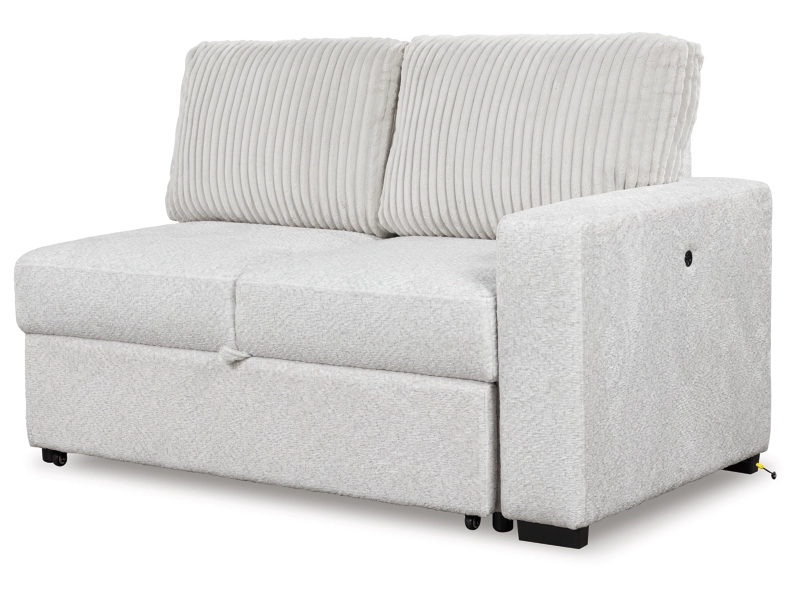 Inside-out cord pop-up sleeper with storage chaise. Featuring drop-down table with cup holders. Built in USB ports (A&C) located on both arms. Textured, ultra-soft mixed media look featuring the 211 size cord in the best selling stupendous alloy color paired perfectly with a plush, cozy polyester. Tight seats and loose reversible back and low-profile accent legs.