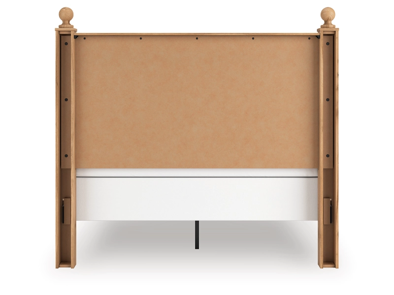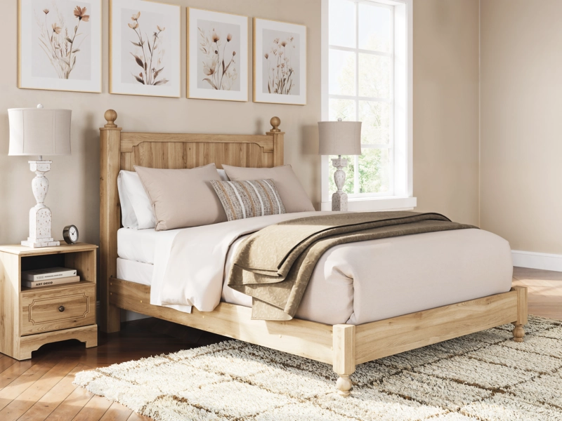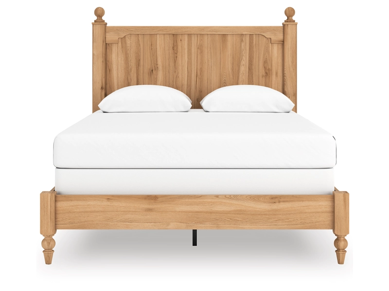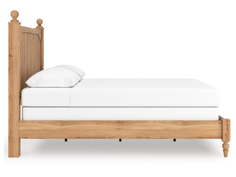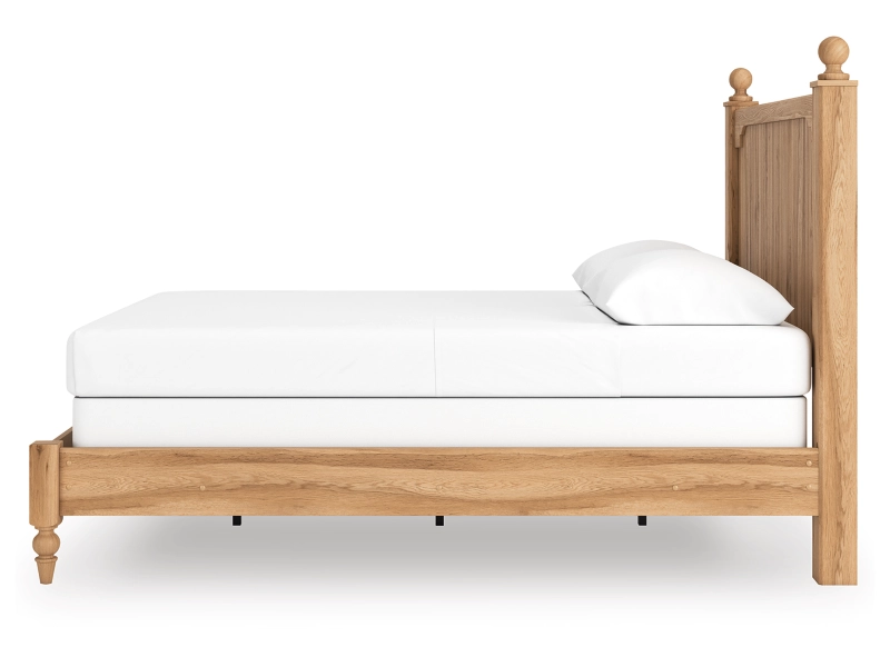 Country rustic. Vintage inspired. However you see it, you’re sure to be charmed by this queen panel bed and its relaxed mix of picturesque aesthetics. A gracefully shaped rail brings dimension to the headboard, while decorative ball tops and turned legs adorn the silhouette in quaint fashion. A warm oak grain finish enhances the bed's air of easygoing elegance, letting you drift away to a simpler time and place.