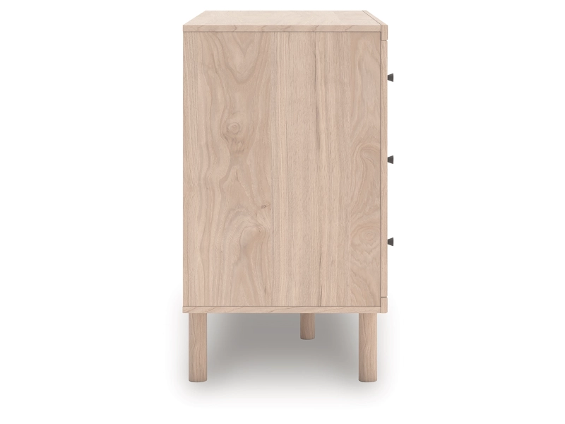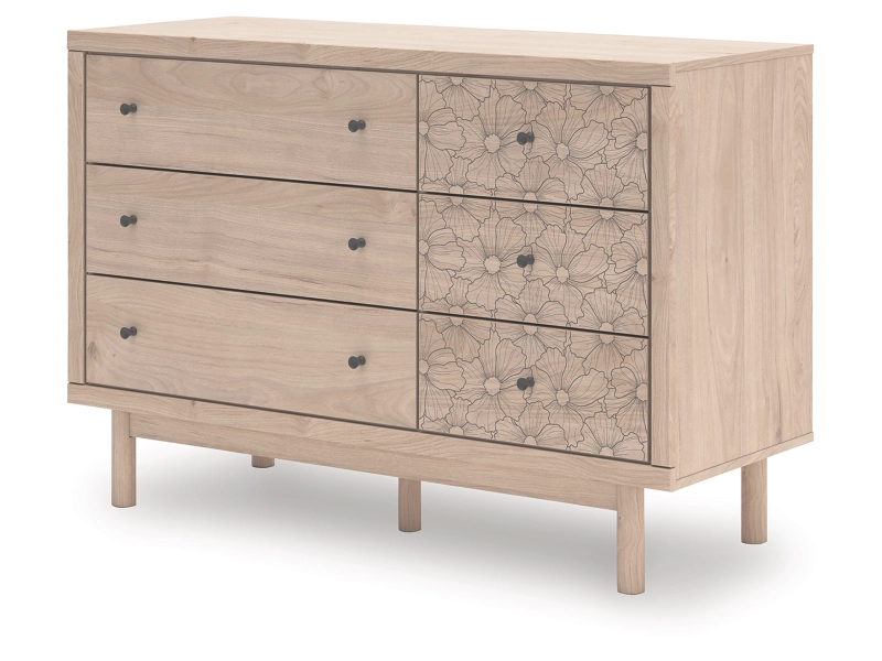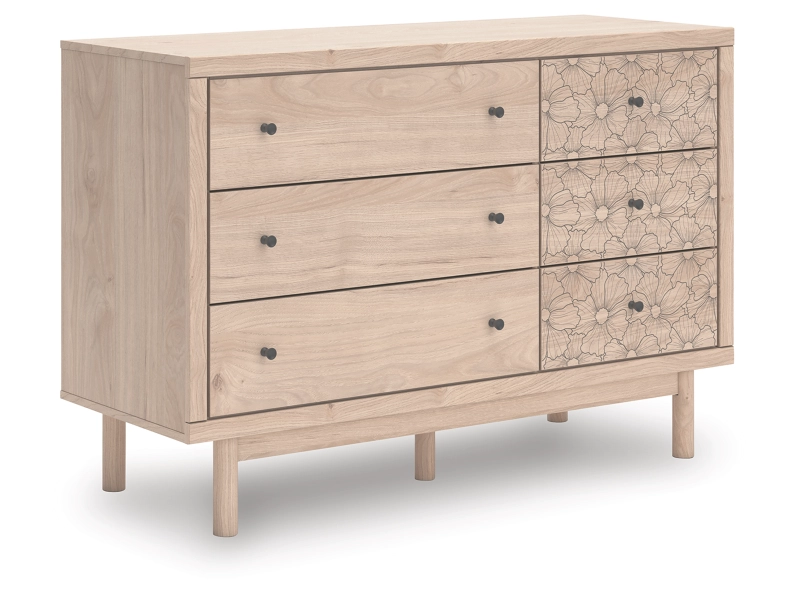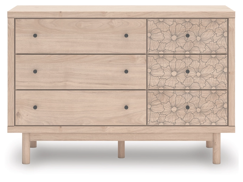 Looking for a dresser that's both playful and practical for your little one? This piece is just the ticket. Its charming design and light wood finish create a whimsical and inviting atmosphere. Drawers accented with a floral pattern add a free-spirited vibe and plenty of storage, so there's no excuse for a messy room.