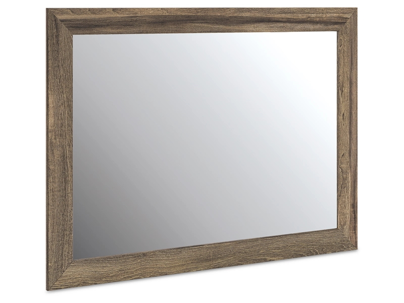 Casually cool style and clean lines go hand in hand with this bedroom mirror. A weathered brown finish over replicated oak grain creates an easygoing vibe, setting the scene in your restful retreat. The fuss-free, versatile piece can be mounted on a wall or dresser.