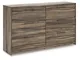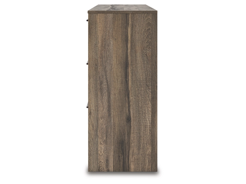 Casually cool style and lots of storage go hand in hand with this bedroom package. A weathered brown finish over replicated oak grain creates an easygoing vibe, setting the scene in your restful retreat. The set's clean lines and modern handles provide a fuss-free look.