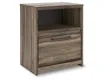 Weathered brown finish over replicated Oak grain with authentic touch. Contemporary handles in an antiqued gunmetal finish. Cases feature faux linen finished drawer interiors. Modern bookcase headboard includes a dimming LED light under the shelf. Side roller glides for smooth operating drawers. Queen and king storage footboard (54S,56S) requires the B100-13 or B100-14 roll slats. Mirror (36) has the versatility to mount on the dresser or to the wall horizontally or vertically. Slim profile dual USB chargers located on the back of the nightstand top and the side of the headboards. Queen (57) and King (58) headboards can attach to a bolt-on metal bed frame B100-31 or B100-66 respectively. Safety is a top priority, clothing storage units are designed to meet the most current standard for stability, ASTM F 2057 (ASTM International). Drawers extend out to accommodate maximum access to drawer interior while maintaining safety.