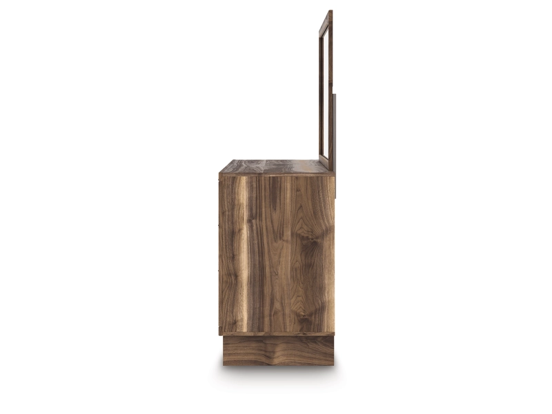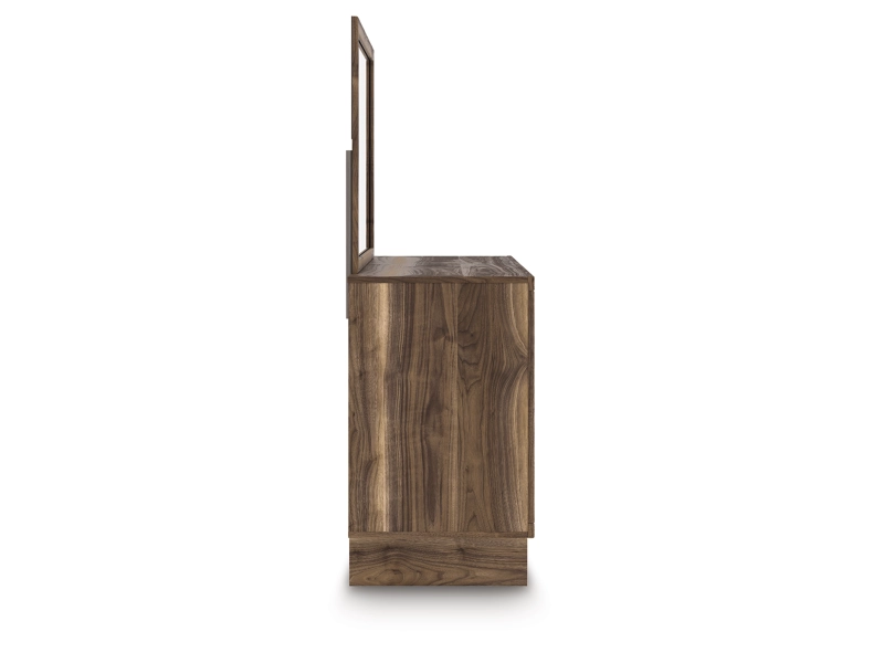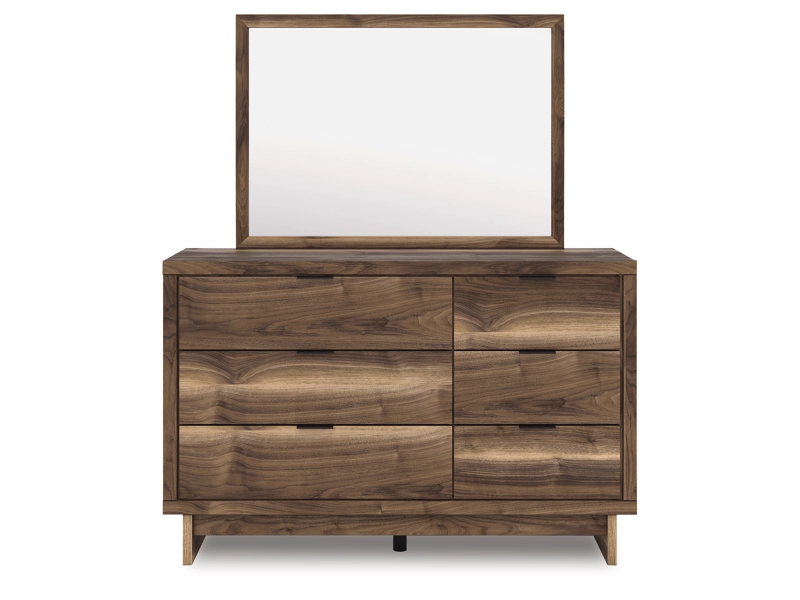 Nostalgic style, retooled for today’s trends. This dresser with mirror puts an elevated twist on mod aesthetics. Its warm brown tones reflect the mid-century vibes you love, while the angular base incorporates contemporary motifs. Integrated drawer handles round out the look in sleek style. With this dresser, you can build your bedroom into a modern haven with a touch of retro-cool flair.