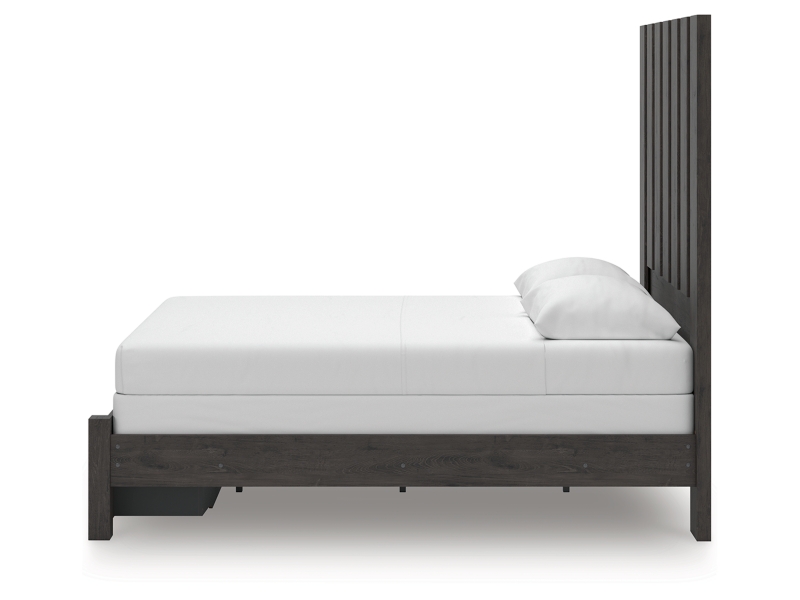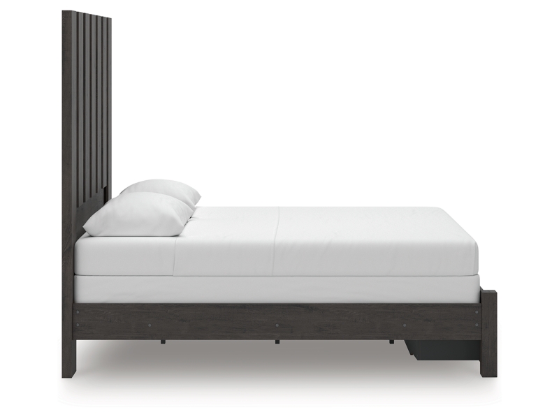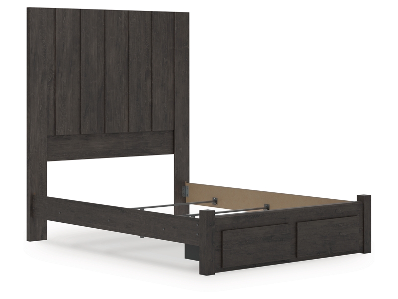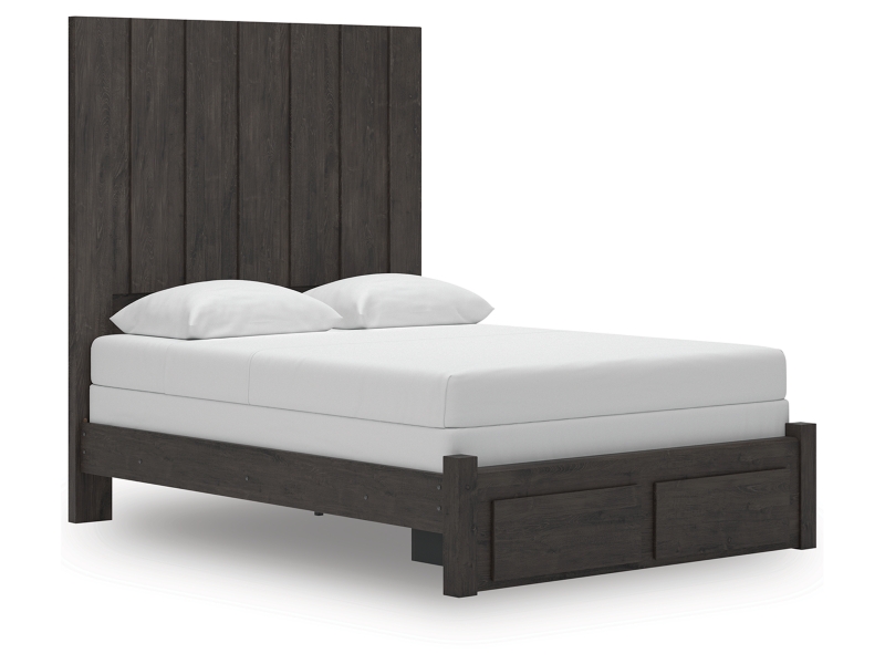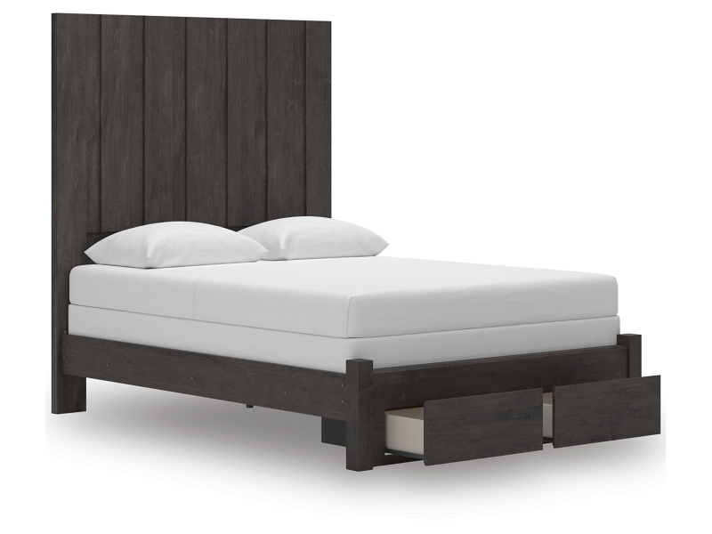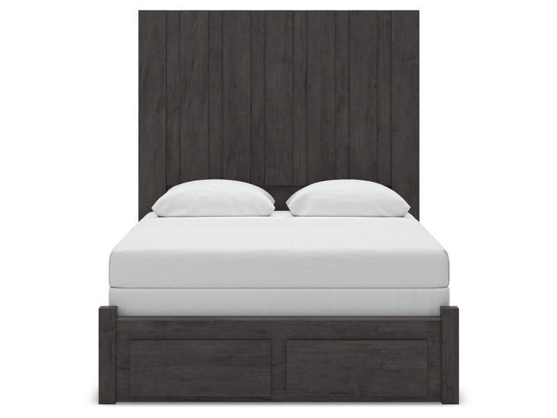 Find serene simplicity in the clean lines and dark neutral tones of this queen panel storage bed. It’s a sincere approach to modern elegance, giving you high style at a great value. Short on storage? Smooth-gliding drawers in the footboard keep clutter neatly tucked away. Vertical planks decorate the generously scaled headboard to give the illusion of additional height, polishing off the piece in grand fashion.