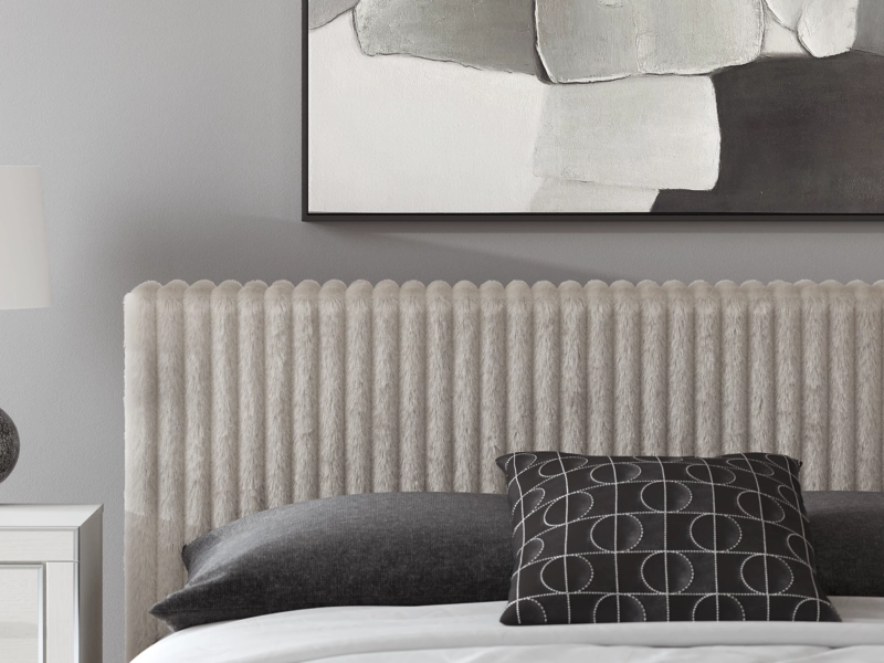 Matte white finish with subtle replicated wood grain. Cases and bed are accented with chrome details. Large scaled chrome handle with faceted details. Headboards are accented with faux fur tufted black upholstery and glitter details. Side roller glides for smooth operating drawers. Drawer interiors are lined with a faux linen laminate for a clean finished look. Both queen (57) and king (58) headboards have a panel footboard (54,56) and storage footboard option (54S,56S). Platform rails (95) can be used with all footboard and headboard options and require the B100-13 or B100-14 roll slats. Queen (57) and king (58) headboards can attach to a bolt-on metal bed B100-31 or B100-66 respectively. Slim USB charger located on the back of the nightstand tops. Mirror (36) has the versatility to be mounted on dresser or wall horizontally or vertically. Safety is a top priority, clothing storage units are designed to meet the most current standard for stability, ASTM F 2057 (ASTM International). Drawers extend out to accommodate maximum access to drawer interior while maintaining safety.