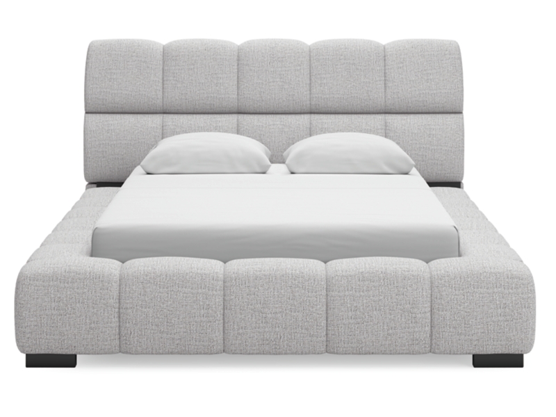 Casual contemporary styling. Fully upholstered platform bed made with engineered wood frames. Large, deep pillowed tufting and textured high-low fabric creates an impressive silhouette that is just as comfortable as it is stylish. Foam cushions covered with stylish light gray Next-Gen Nuvella performance fabric for worry free cleanability. The foundation features nested bunkie boards that are fully wrapped in a non-woven fabric for a snag-free surface to lay your mattress. No box-spring foundation needed. Side rails feature laminated solid hardwood slat support rails (or LVL) with glued and screwed blocking for added strength.