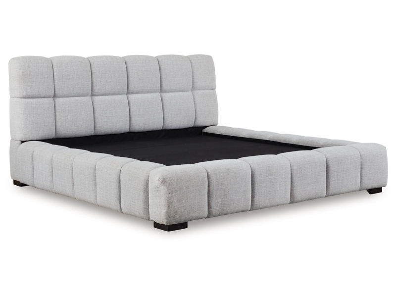 Casual contemporary styling. Fully upholstered platform bed made with engineered wood frames. Large, deep pillowed tufting and textured high-low fabric creates an impressive silhouette that is just as comfortable as it is stylish. Foam cushions covered with stylish light gray Next-Gen Nuvella performance fabric for worry free cleanability. The foundation features nested bunkie boards that are fully wrapped in a non-woven fabric for a snag-free surface to lay your mattress. No box-spring foundation needed. Side rails feature laminated solid hardwood slat support rails (or LVL) with glued and screwed blocking for added strength.