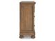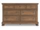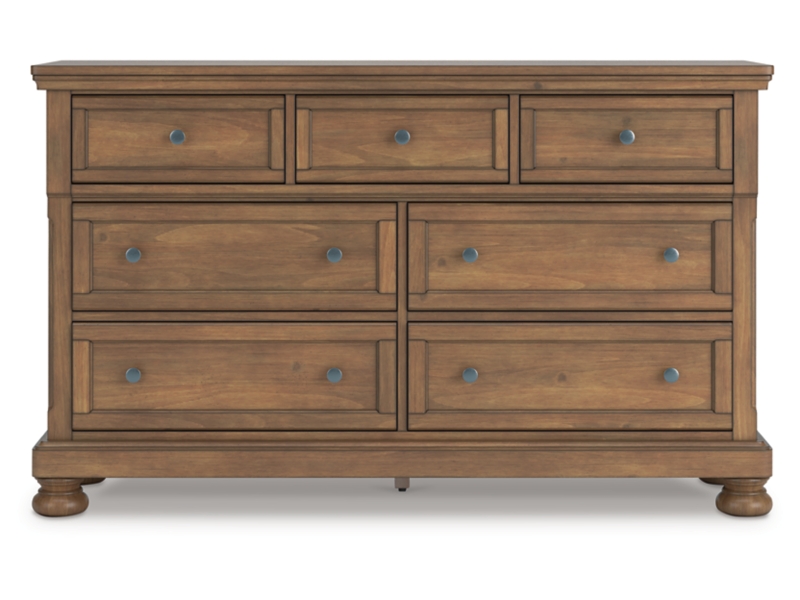 A relaxed take on casual traditional design, this dresser strikes a comfy pose with a classic sensibility. Its timeless design and chestnut brown wood tone create a welcoming retreat tailored to your laid-back lifestyle. Metal knobs in an aged pewter color subtly dress up drawers packed with storage possibilities. A hidden pull-out tray behind the top center drawer keeps your small valuables out of sight.