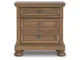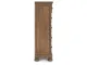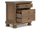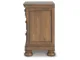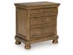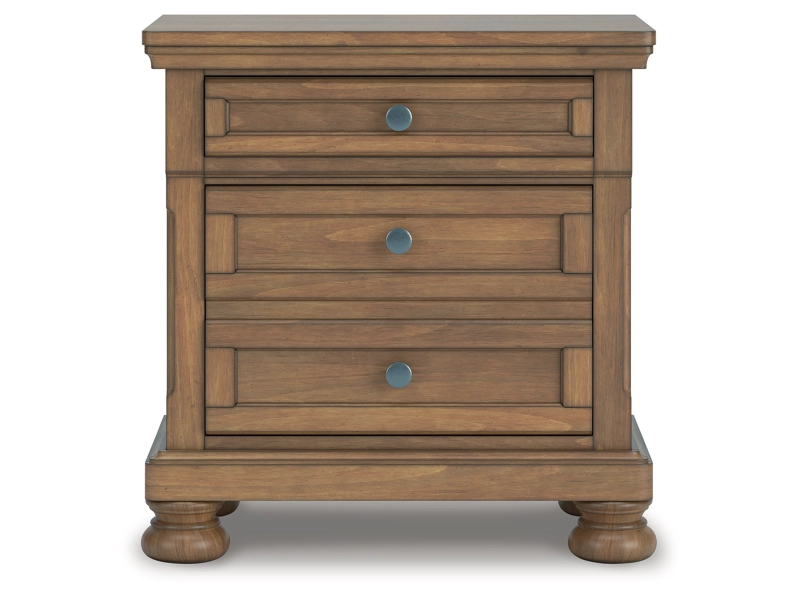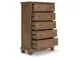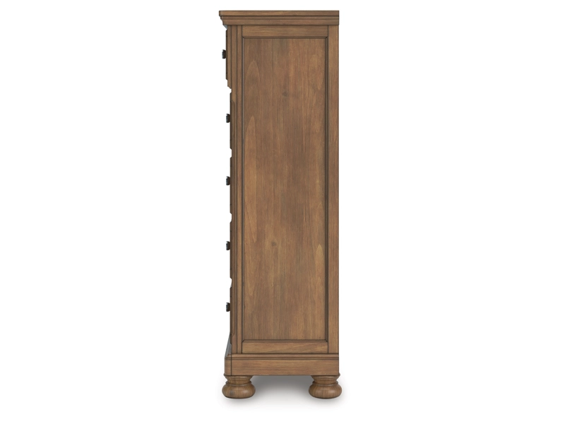 Casual traditional styling. Made with Pine solids and veneer with MDF substrate. Finished in a chestnut brown wood tone. Case designs feature casual traditional styling for a timeless retreat. Framed inset drawers feature fully finished interiors, English dovetail construction and heavy duty ball-bearing side glides. Top drawers have black felt bottoms. Round metal knobs finished in an aged pewter color. Special features include a concealed jewelry tray in the upper center drawer of the dresser, and an additional hidden tray in the nightstand for other valuable items. Both the sleigh headboards (77/78) or panel headboards (57/58) can use either storage footboards (74/98 and 76/99) and panel footboards (54/96 and 56/97).