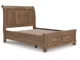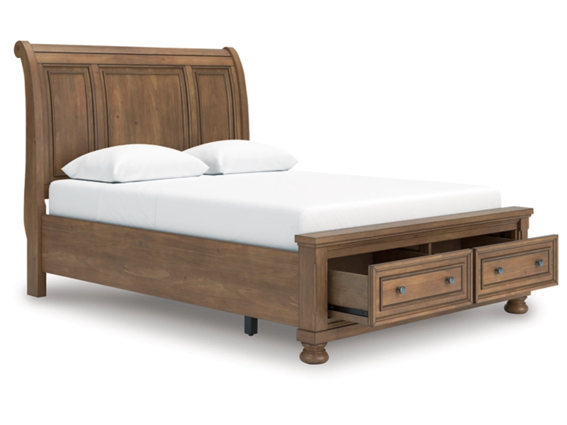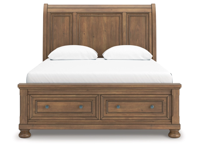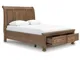 A relaxed take on casual traditional design, this queen storage sleigh bed strikes a comfy pose with a classic sensibility. Its timeless design and chestnut brown wood tone create a welcoming retreat tailored to your laid-back lifestyle. Metal knobs in an aged pewter color subtly dress up footboard drawers packed with storage possibilities. Now there’s a bed with staying power.