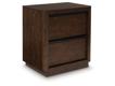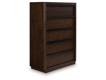 Casual contemporary styling with a modern vibe. Made with hardwood solids, Mango wood veneer and MDF substrates. Features a complex, rich dark brown finish. The cases are designed for modern living with soft rounded pilasters, raised plinth bases, inset drawer fronts with full length metal rail pulls in a matte black finish. Drawers feature dovetail construction, fully finished interiors with heavy duty ball-bearing side glides for smooth function. Upper drawers have felt bottoms. Dress your room with modern elegance and comfort with your choice of two outstanding beds offered in this collection, each offering a cushion headboard covered in black textured chenille fabric. The poster bed offers a trend-right design aesthetic with an integrated "X" canopy and full wrap-around rails set to the floor for a clean bedroom environment. The stylish panel bed features a cozy upholstered headboard panel with layback comfort. Dual USB-A and USB-C charging ports conveniently located in each side of the headboard on both bed options.