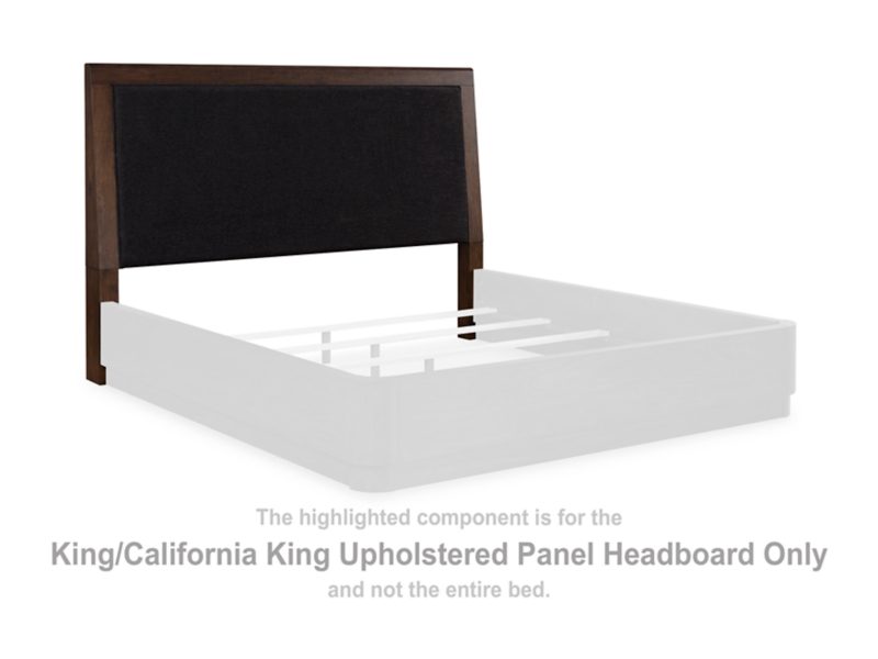 This king/California king upholstered panel headboard is made with hardwood solids, mango wood veneer, MDF substrates and a foam cushion with polyester upholstery. Pairs with other items in the series to make a bed kit.