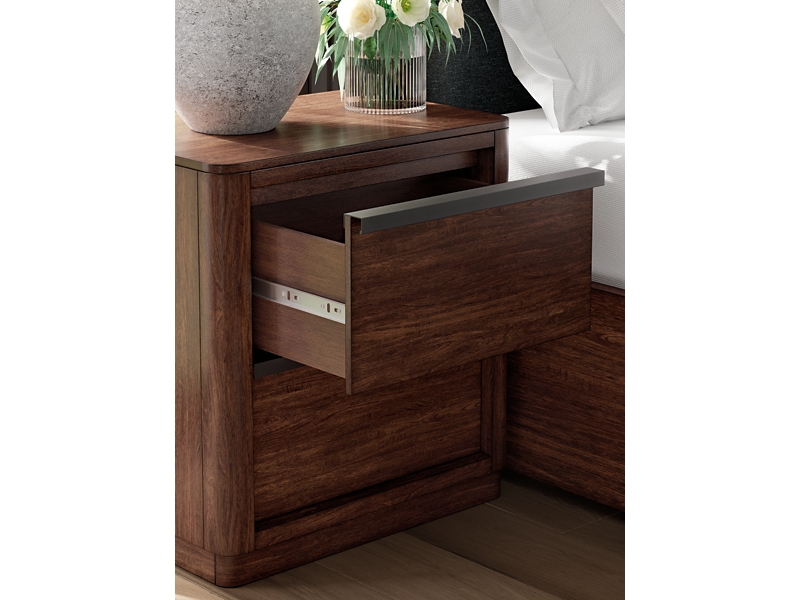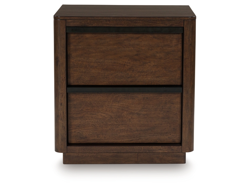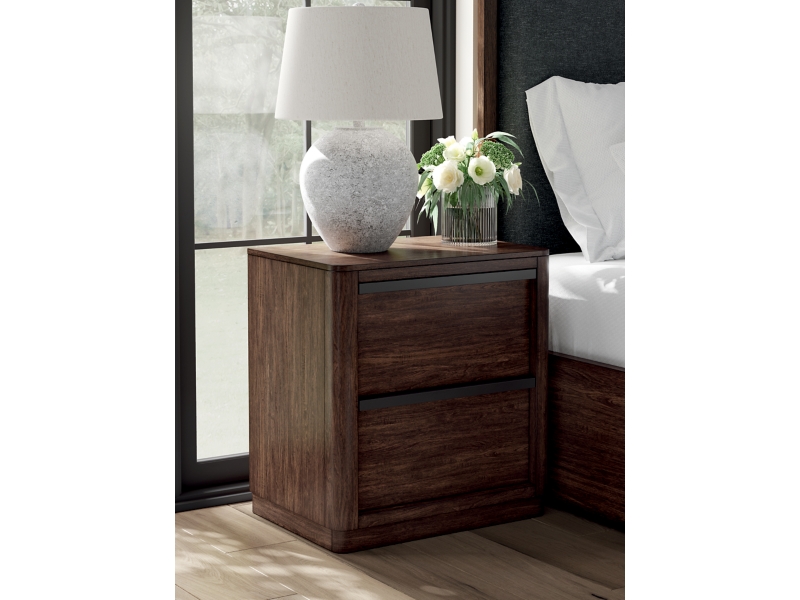 Casual contemporary styling with a decidedly modern vibe. This nightstand is warm and inviting with a rich dark brown finish, adorning your restful retreat with on-trend elegance. Full-length metal pulls in a matte black finish add a subtly cool touch to spacious bedside storage drawers. What a simply stunning way to achieve the bedroom of your dreams.