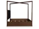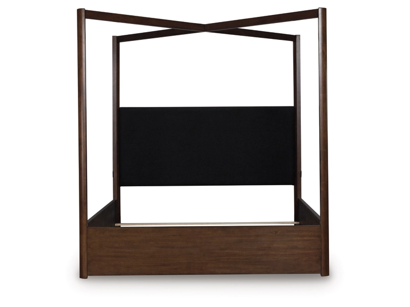 Casual contemporary styling with a decidedly modern vibe. Bathed in a rich dark brown finish, this queen canopy bed is warm and inviting. Its integrated “X” canopy and full wrap-around rails set to the floor adorn your restful retreat with on-trend elegance. Dual USB charging on both sides of the upholstered headboard is a subtly cool way to keep your electronics at the ready. What a simply stunning way to achieve the bedroom of your dreams.