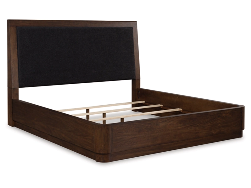 Casual contemporary styling with a decidedly modern vibe. Bathed in a rich dark brown finish, this queen upholstered panel bed is warm and inviting. Full wrap-around rails set to the floor adorn your restful retreat with on-trend elegance. A cozy upholstered headboard with layback comfort features USB charging on both sides to keep your electronics at the ready. What a simply stunning way to achieve the bedroom of your dreams.