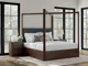 Casual contemporary styling with a decidedly modern vibe. Bathed in a rich dark brown finish, this California king canopy bed is warm and inviting. Its integrated “X” canopy and full wrap-around rails set to the floor adorn your restful retreat with on-trend elegance. Dual USB charging on both sides of the upholstered headboard is a subtly cool way to keep your electronics at the ready. What a simply stunning way to achieve the bedroom of your dreams.