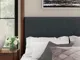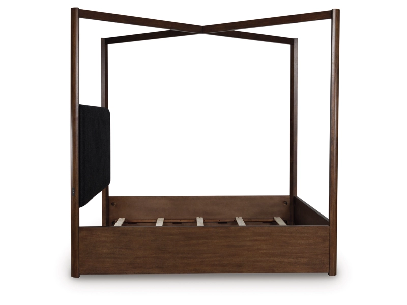 - Includes canopy, upholstered headboard, footboard, rails, posts and slats