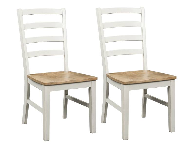 Busy breakfasts and family dinners get a dose of modern farmhouse flair with this set of 2 dining chairs. Its two-tone finish contrasts a light butcher block hue with an antiqued white frame for an utterly charming effect. A contoured seat elevates the comfort level. Complete with a ladderback design, it's an effortless seating solution with chic character.