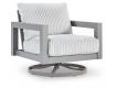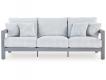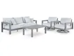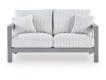 Aluminum. Nuvella high performance fabrics. Loveseat includes 2 throw pillows. Sofa includes 4 throw pillows. Assembly required.