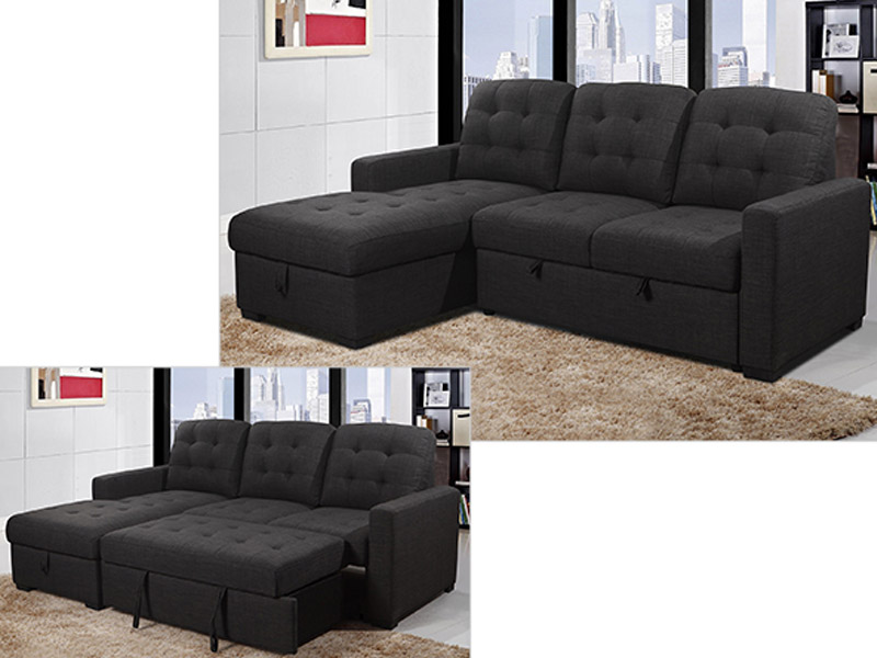 Montez contemporary multi-functional sectional and sleeper ensemble quickly and easily converts to large flat sleeping surface. Additional features include tufted cushions, and storage in the base of the chaise. Available in either LHF chaise (pictured), or RHF chaise configurations.