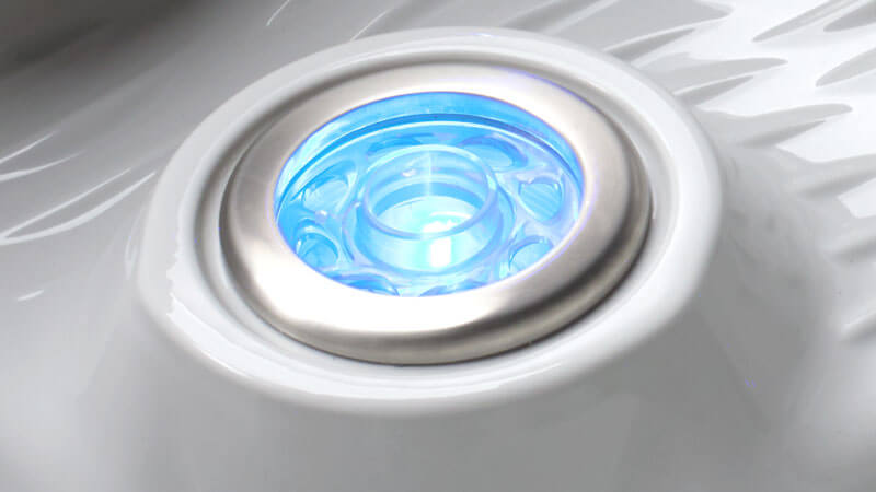 The interior lighting system features multiple points of LED light that accent the contours of the spa shell. Two exterior LED lights integrate with the front corners of the spa, creating an elegant look.
