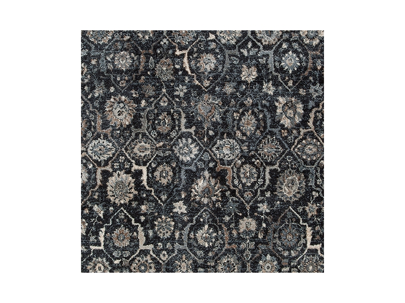 Machine woven cut pile, Persian style floral design with boarder in shades of blue, gray, cream and brown. 15mm pile. Polyester, backed with latex. Spot cleaning only. Rug pad recommended.