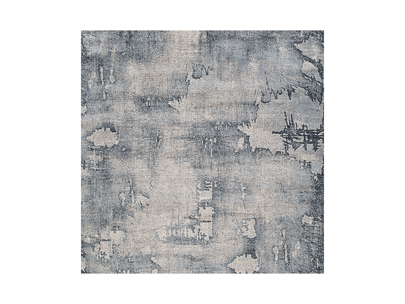 Machine woven cut pile, abstract design in shades of blue, gray and cream. 15mm pile. Polyester, backed with latex. Spot cleaning only. Rug pad recommended.