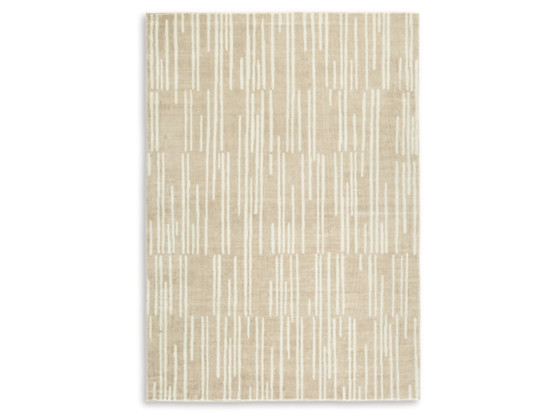 Machine woven, printed abstract linear design in cream and tan. 7mm pile. Polyester, backed with TPR/polyester/cotton blend. Machine washable. Rug pad recommended.