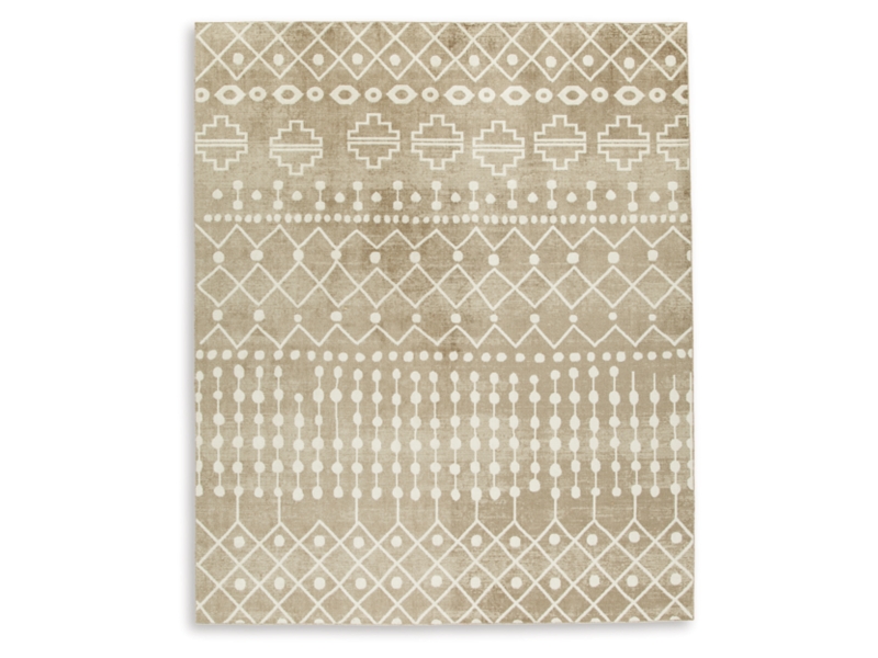 Machine woven, tribal design in tan, brown and cream. 4mm pile. Polyester, backed with cotton. Machine washable. Rug pad recommended.