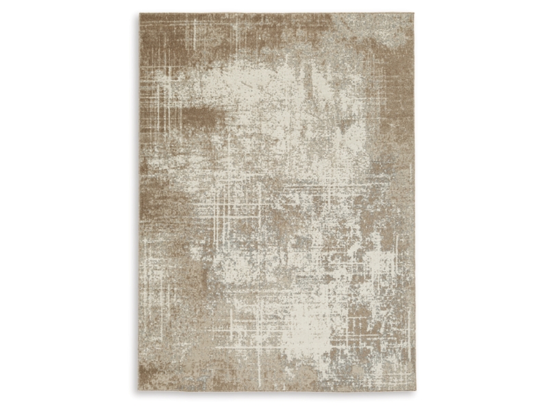 Machine woven, abstract design in tan, brown, gray and cream. 4mm pile. Polyester, backed with cotton. Machine washable. Rug pad recommended.