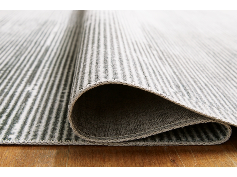 Machine woven, printed abstract linear design in black, white and gray. No pile. Polyester, backed with TPR/polyester/cotton blend. Machine washable. Rug pad recommended.