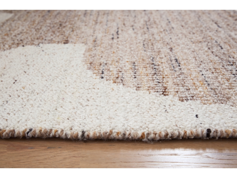 Hand woven, abstract design in shades of brown and beige. No pile. Polyester, backed with cotton. Spot clean only. Rug pad recommended. Due to the handcrafted nature of this product, some variation may occur.