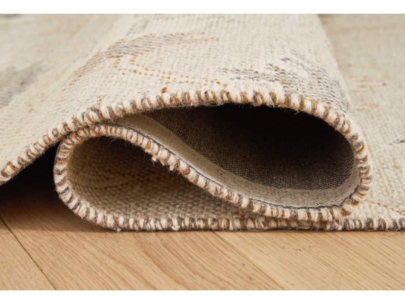 Hand woven, floral design in linen, beige, gray and caramel. No pile. Wool/polyester blend, backed with cotton. Spot clean only. Rug pad recommended. Due to the handcrafted nature of this product, some variation may occur.