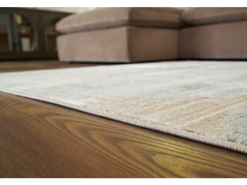 Machine woven, abstract design in linen, gray and caramel. 10mm pile. Polyester, backed with latex. Spot clean only. Rug pad recommended.