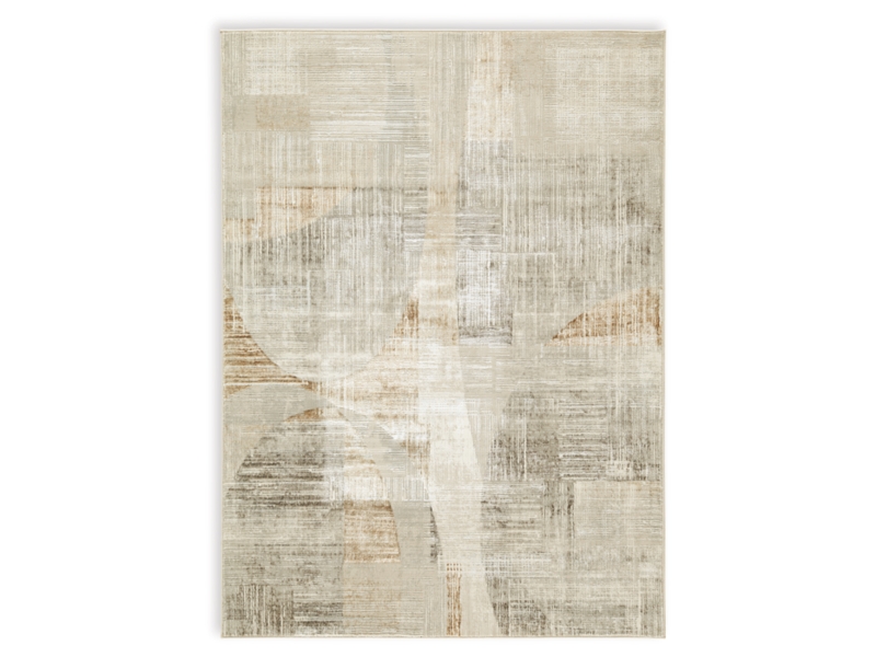 Machine woven, abstract design in linen, gray and caramel. 10mm pile. Polyester, backed with latex. Spot clean only. Rug pad recommended.