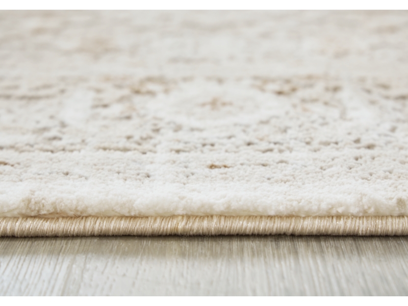 Machine woven, Persian style medallion design in shades of ivory, gray and tan. 9 mm pile. Polyester, backed with jute. Spot clean only. Rug pad recommended.