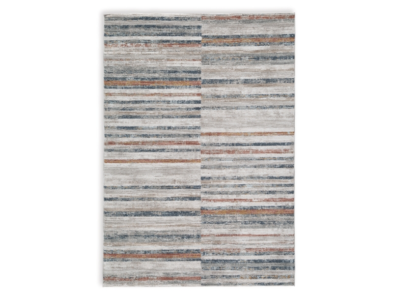 Machine woven, stripe design in shades of beige, gray, blue, gold and amber. 8mm pile. Polyester, backed with cotton. Spot clean only. Rug pad recommended.